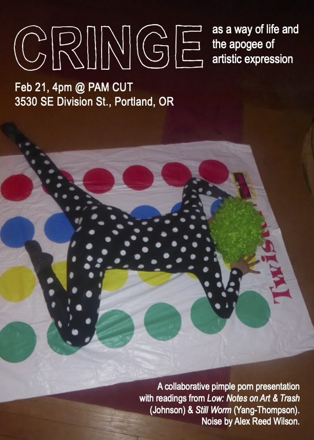 Performance artist Ashley Yang-Thompson and author Jaydra Johnson lead a collaborative pimple porn presentation on the idea of “Cringe”. Cringe has become a referent for overly earnest, uncool, or passe behavior. But what if cringe vulnerability is actually the path to freedom? In this collaborative presentation, Ashley and Jaydra will reach their hands deep inside the belly of cringe, feel around in the viscera, and ultimately expose its guts. Through images, video, and readings of their work, they will trace the development of their understanding of cringe as a way of life and the apogee of artistic expression. They will even risk doing something as cringeworthy as quote David Foster Wallace when he says, “The new rebels might be artists willing to risk the yawn, the rolled eyes, the cool smile… who treat of plain, old, untrendy human troubles and emotions with reverence and conviction.” With musical guest Alex Wilson.