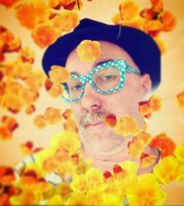 [Image of non-binary person with fedora, polka dot glasses and mustache. Orange flowers flutter around their face.]